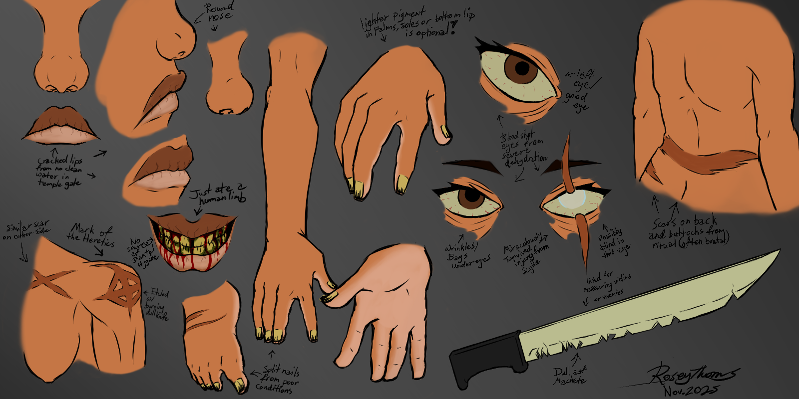 her eye had been sliced into, missing her brain by a hair. Her skin is medium, pale, olive. Her teeth are rotten and